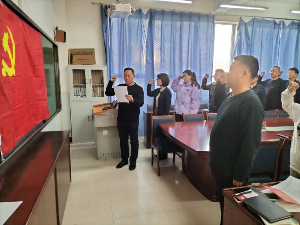 怀着对党的尊敬,宣誓仪式正式开始。组织委员王玉明首先宣读了预备党员名单,并带领预备党员及全体党员进行宣誓。大家面朝鲜艳的党旗,举起右手,顿时,激昂的宣誓声回荡在会议室,这庄严的一刻,烙印在每一位党员心中。