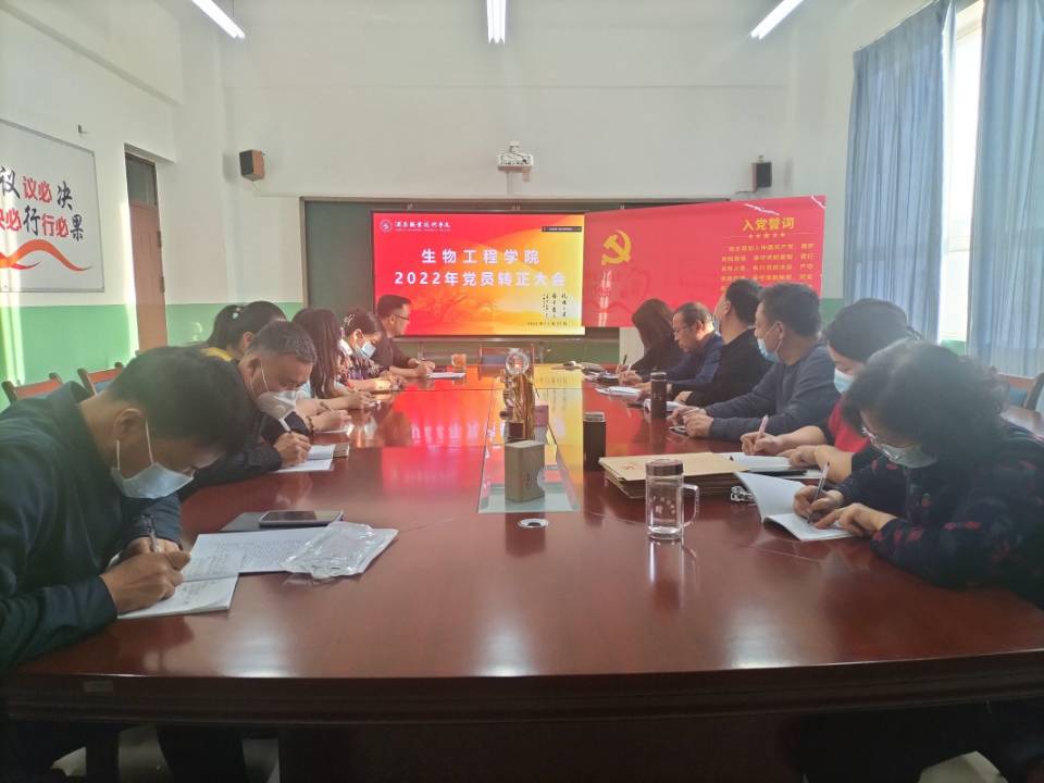 深入学习贯彻党的二十大精神,严格践行中国共产党章程。11月22日下午,生物工程学院党支部在逸夫楼315会议室通过线上线下结合召开支部党员大会,会议由支部组织委员庞捷主持。本次大会对秦新惠、王洪亮2名教师预备党员,李晓琴、张富家等11名学生预备党员发展成为中国共产党正式党员进行讨论和表决。生物工程学院党支部全体党员和预备党员参加本次会议。