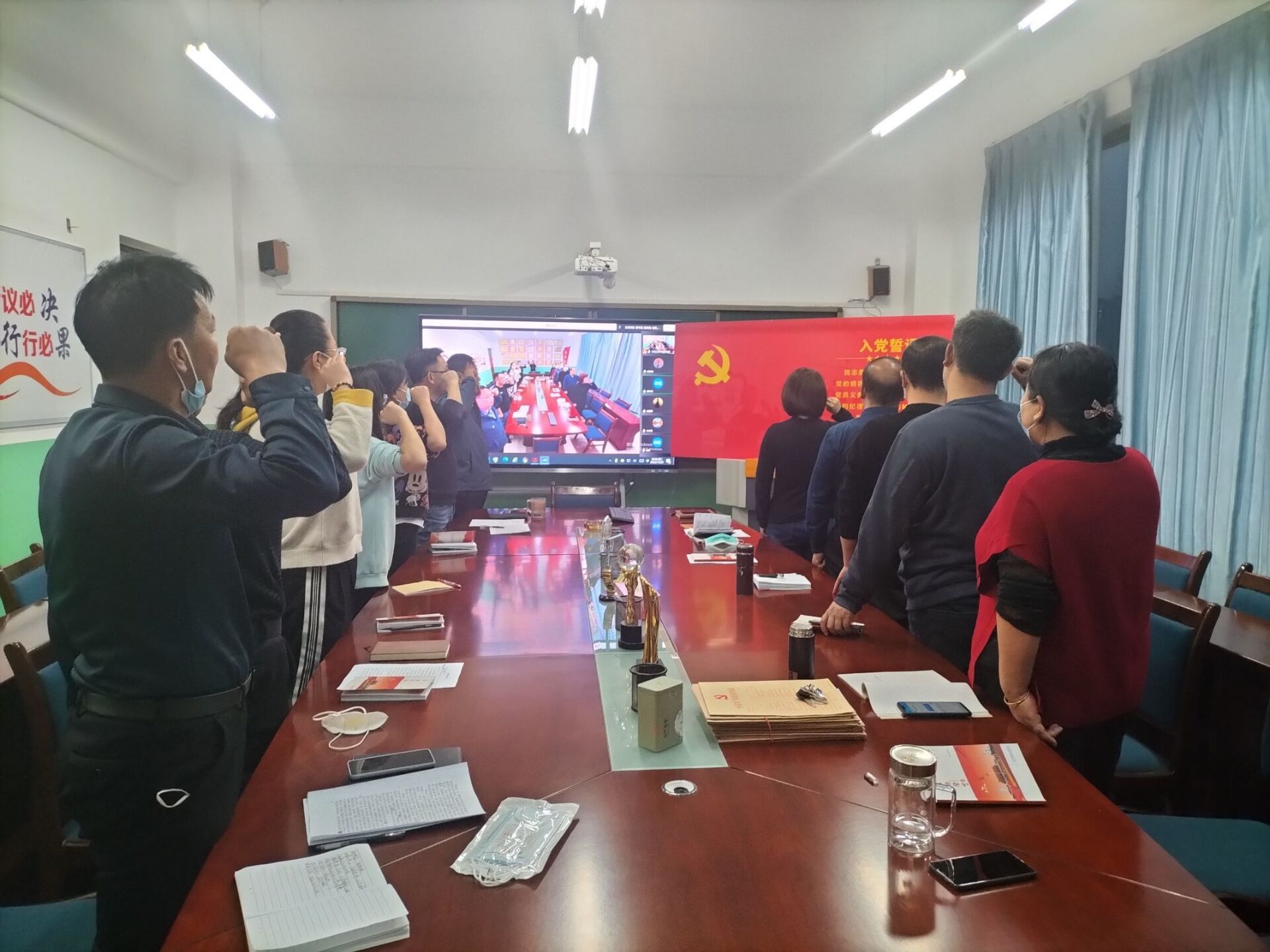 首先,13名预备党员相继提交各自转正申请,汇报预备期自己在思想、工作和生活等各个方面的情况;每个培养人介绍各自培养的预备党员在预备期的考察情况。所有参会的党员对即将转正的13名预备党员相继发表各自的意见、指出不足及后续改进建议。随后,13名预备党员逐一表明自己的决心和态度,支部所有参会党员以不记名投票的方式,对13名预备党员的转正议题进行大会讨论、表决,最终全票通过秦新惠等13位预备党员转正成为中国共产党员。生物工程学院党支部副书记张涛带领全体党员重温入党誓词,进行入党宣誓。