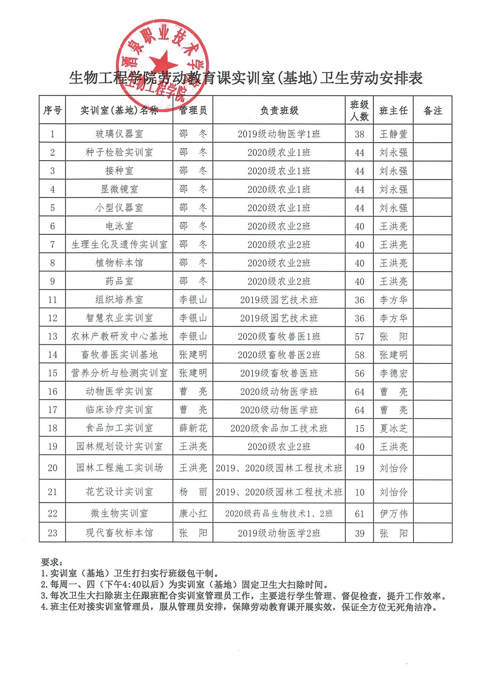 生物工程学院2020-2021学年第一学期实训室卫生安排表