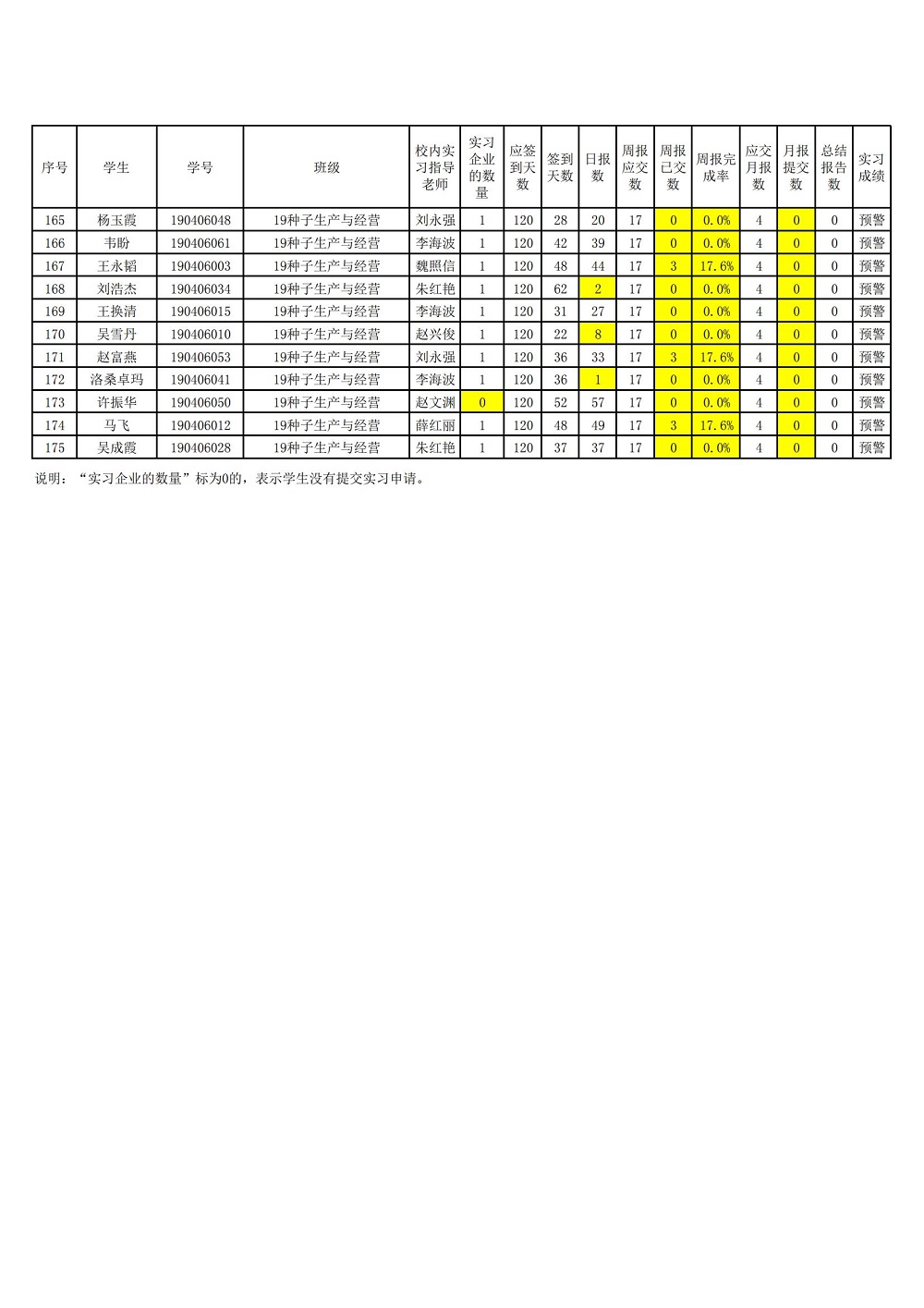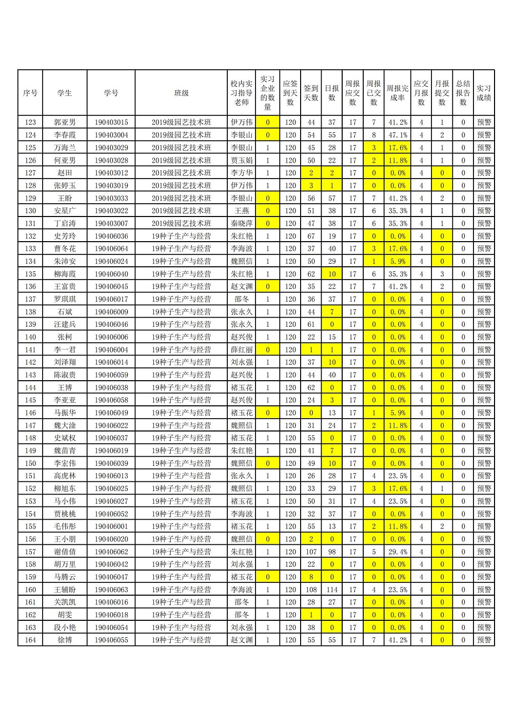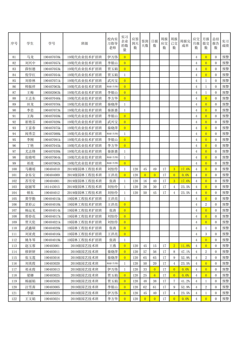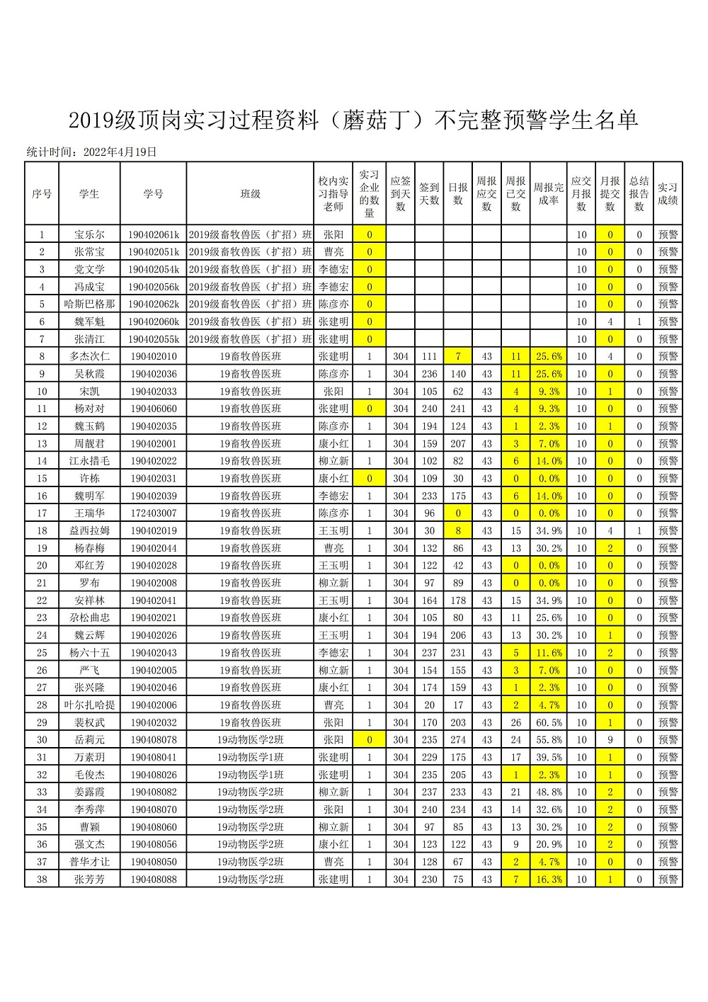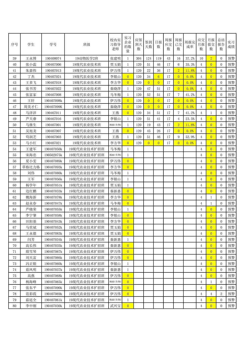 2019级顶岗实习手续预警学生名单