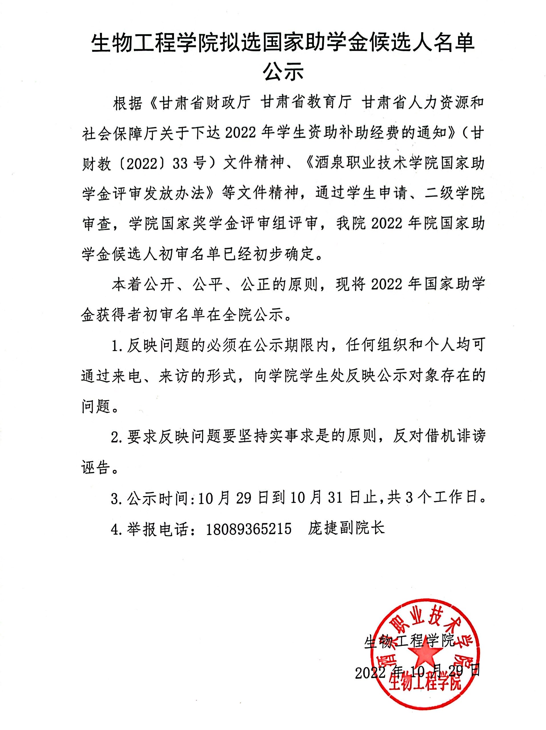 生物工程学院2022年拟选国家助学金候选人名单公示