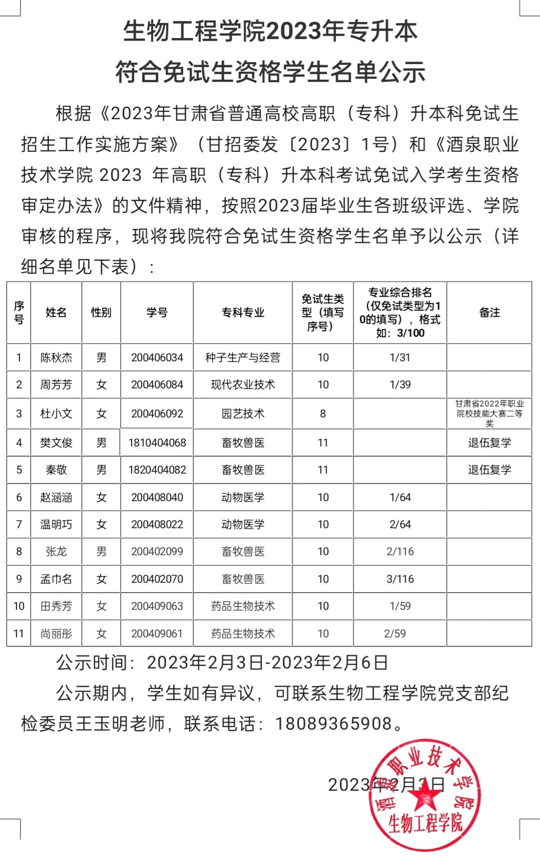 生物工程学院2023年专升本符合免试生资格学生名单公示