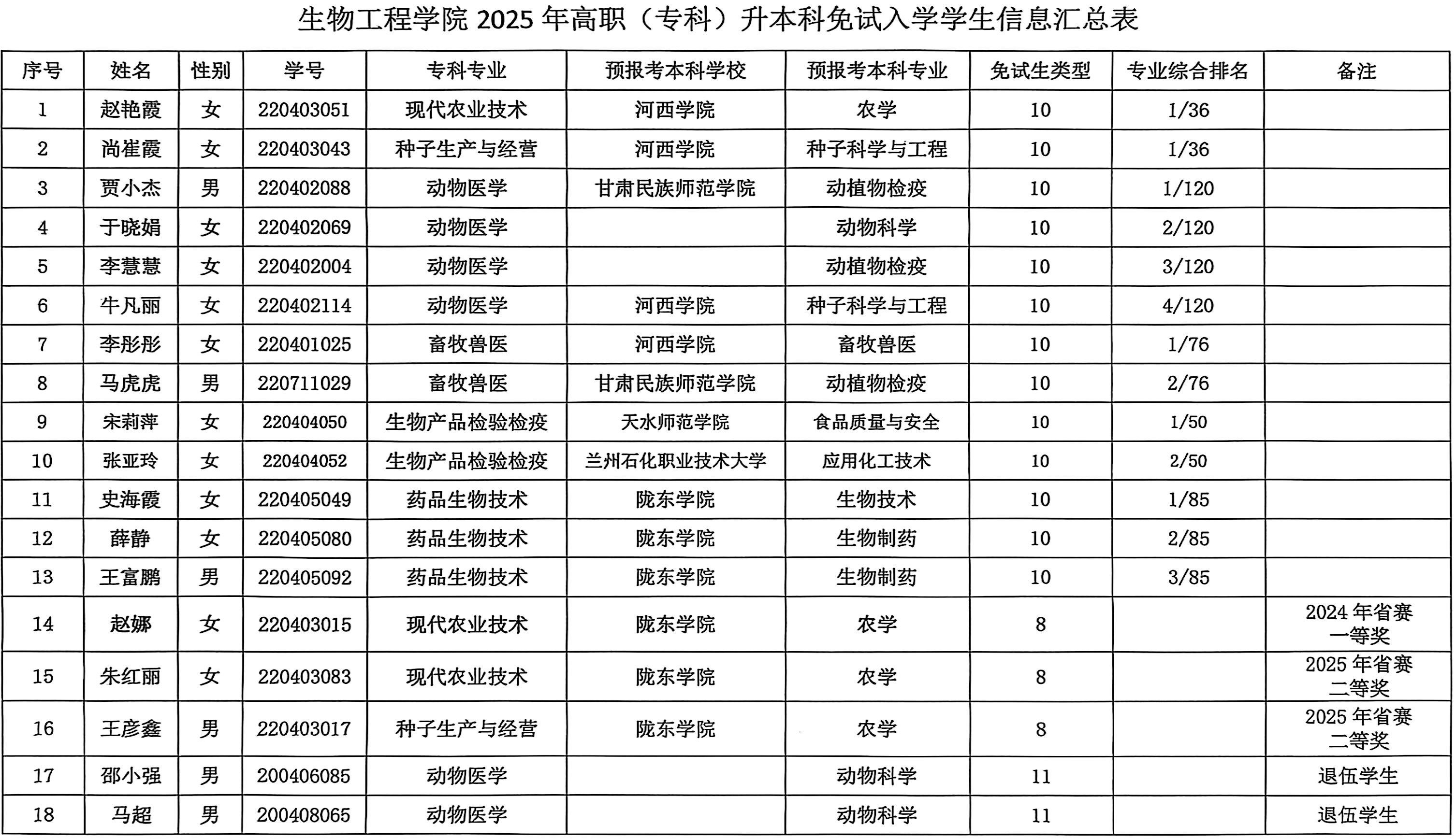 生物工程学院关于2025年高职(专科)升本科免试生名单的公示
